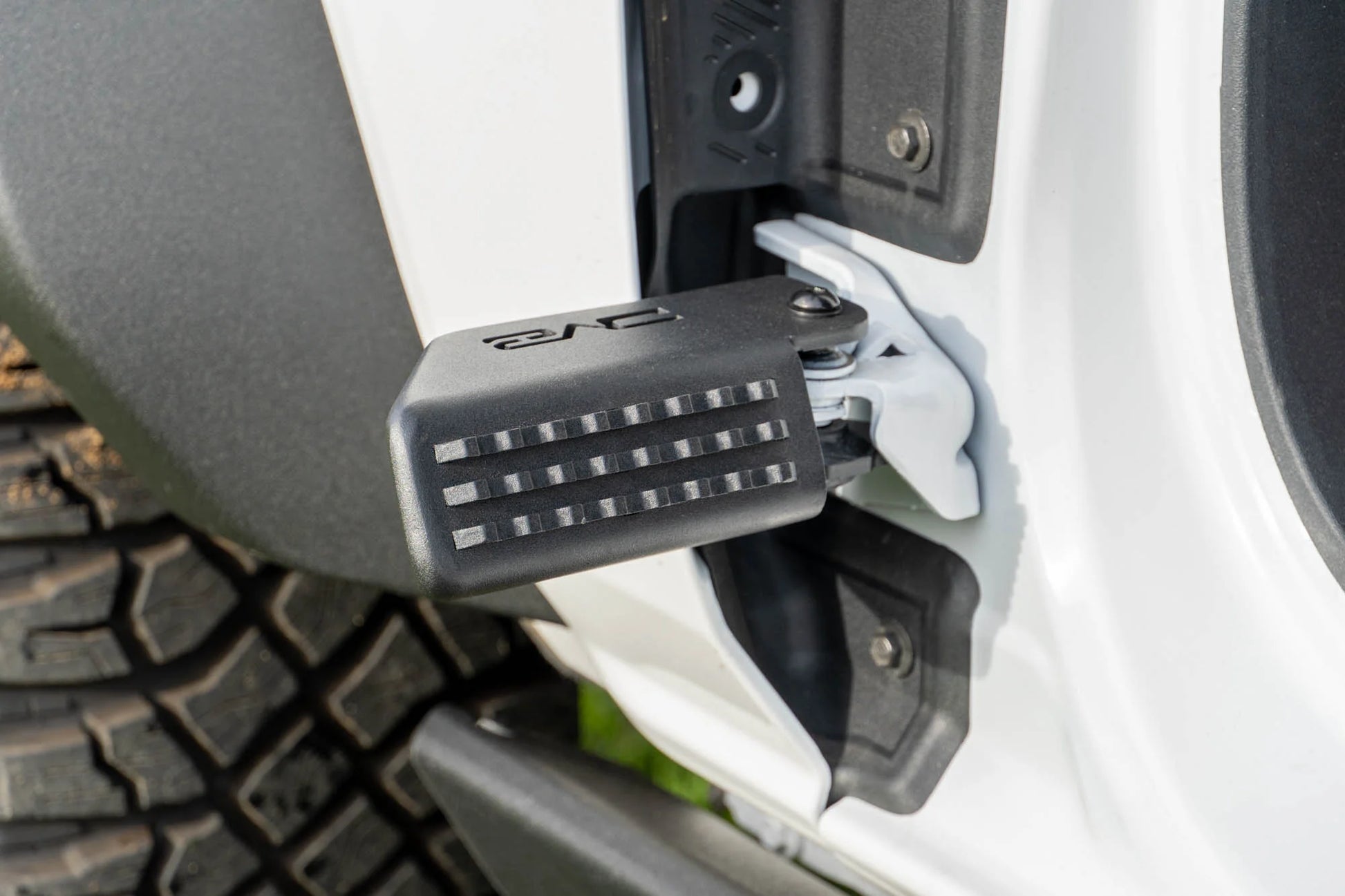 When running your Bronco without the doors, it’s nice to kick your foot out in a comfortable position. Our Bronco Foot Pegs give you a relaxing spot to rest your foot and enjoy the open air experience. Sold as a pair, these foot rests easily mount to either the front or rear door hinges. They are easily removable when mounting the doors back on the Bronco. The pegs are finished in a micro-texture black powder coat for both style and protection against the elements.
