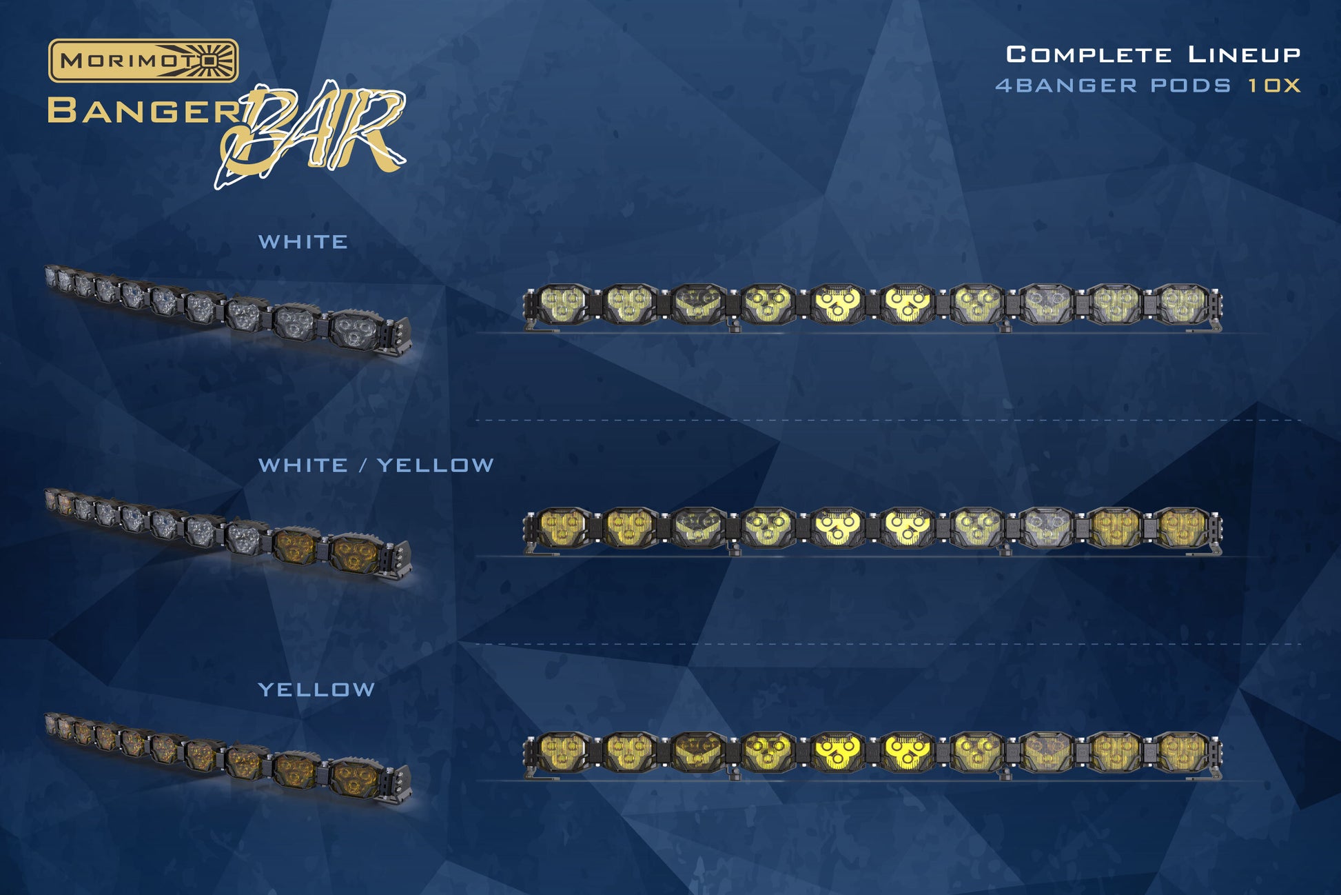 Off-Road Reinvented: Since 2008, Morimoto has been building the best lighting upgrades for the automotive aftermarket...Consistently turning out products packed with more performance, reliability, and best in-class fitment & style. The 4Banger Bar continues that tradition as a bespoke light bar, where you spec the power. You spec the color. You spec the length. You set the radius. And then you destroy the darkness. Every bar is pre-spec'd with the 4Banger Pods, the inner links, a set of universal end-mounts, and all the hardware necessary to assemble. 4Banger NCS and HXB: The 4Banger packs industry-leading performance into their compact footprint, making them the perfect platform for the double row BangerBars. The NCS version provides maximum bang for the buck and out-performs most everything else in their class. The HXB version sits at the top of the performance totem-poll, produces maximum output. With the latest LED chips from Osram inside, each pod is a serious powerhouse of its own. Straight or Curved: Here, you have a full range of adjustability. The entire bar can be setup either straight or curved from the end to end. It can also be setup straight in the center, and angled only on the outer edges. The beefy, CNC machined aluminum links are all independently adjustable, allowing you to dial it in for every application. They are a perfect addition to any front bumper, grille, or roof rack. Performance: The 4Banger Bars are configured to pack some serious punch by pairing our combo, spot, and wide beam pods into a high output light bar. LucidShape and SolidWorks were used to optimize both optical and thermal performance around the most modern, lumen-dense LEDs from Nichia and Osram. With two performance tiers, white, yellow or a white/yellow combo setup, there is a 4Banger Bar to suit every performance need and driving style. Intensity and Coverage: The Combo beam provides a blend of width and distance illumination making every day driving in the middle of nowhere far more comfortable. The wide optics produce a very wide beam that drastically improves visibility off to the sides of the road. The spot beam Illuminates well into the distance and features a highly focused 5-degree hot spot, making it the perfect weapon for long range visibility. While each of these easily does the job on its own, nothing will compare to their coverage when combined. All Weather: The white-output version is ideal for maximum-visibility in the middle of the night. For those who desire optimal output in rain, snow, or fog,the Yellow-output version will slay in shady weather--and if you are ready to roll rain or shine, go with the white/yellow combo; where we spec yellow optics that are ideal for nearfield visibility and white output for central illumination. Reliability: With power comes great responsibility. Extensive effort went into ensuring the reliability of the product. High power means high heat, which is why the 4Banger pods features a copper DTP (direct thermal path) PCB that maximizes heat-transfer to the radiator, which has been optimized through numerous rounds of thermal analysis. The cast aluminum shell is electroplated before powder coating to withstand flaking. The gasket system, integrated DT power connection, and breather valves all designed according to IP69K standards for full weather resistance. All BangerBar hardware is CNC machined from solid aluminum and then protected with a dual-layer anodized finish. Your roof rack will rip off your truck before the BangerBar fails. Power Up: The Morimoto BangerBar has been developed from the ground up to set a new standard in their segment, and the same goes for the wire harness that comes included. Not one component on the harness was overlooked for the sake of cost or simplicity. Triple sealed proprietary 4-pin relay with hanger. Proprietary over-molded inline fuse holder. DT06-2S female outputs with dual seals. Proprietary M-Spec push button switch with Amber-LED backlight is wired with a quick-disconnect for an easy installation into the cabin. The harness can be setup to control all pods together, or the inner and outer pods independently.