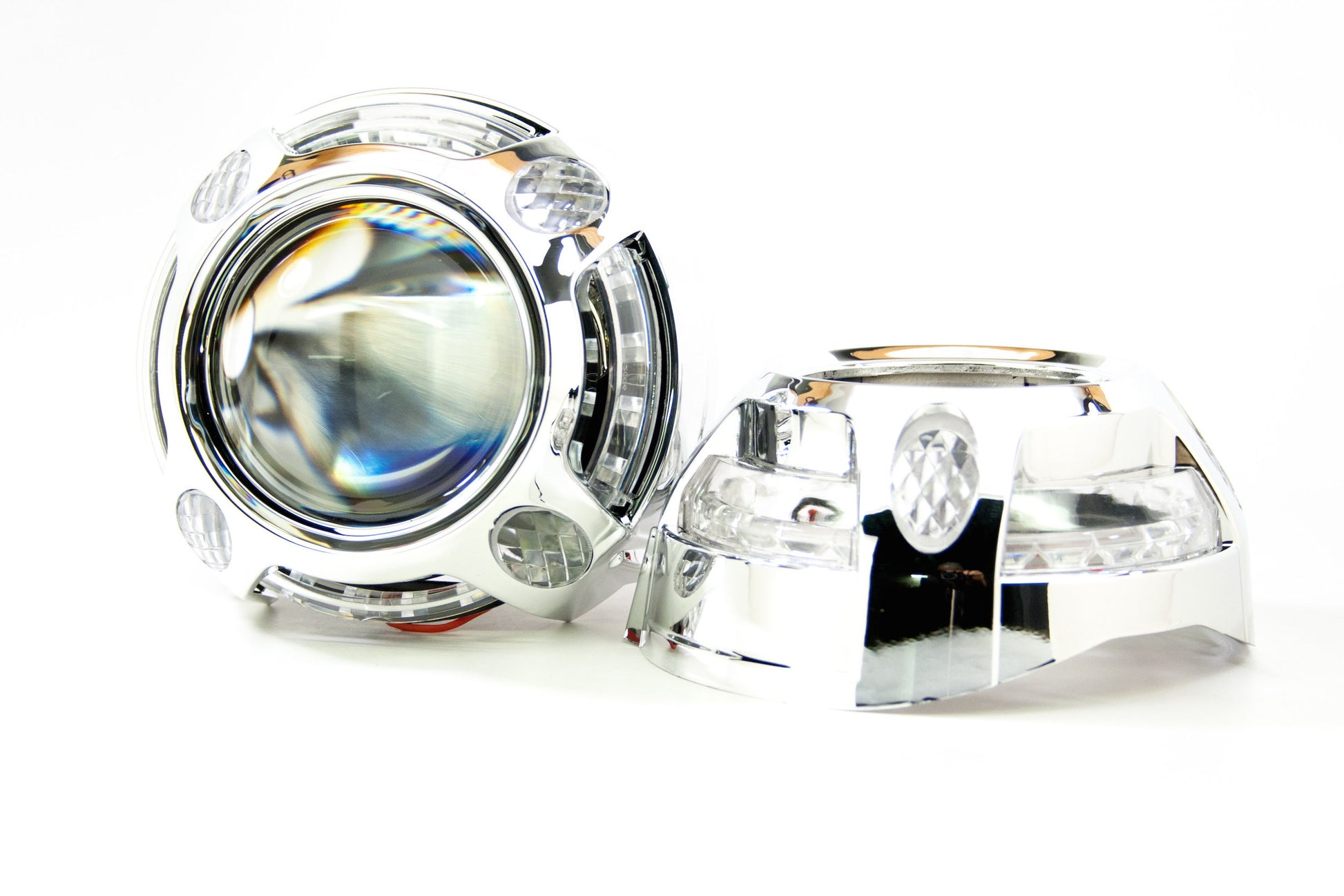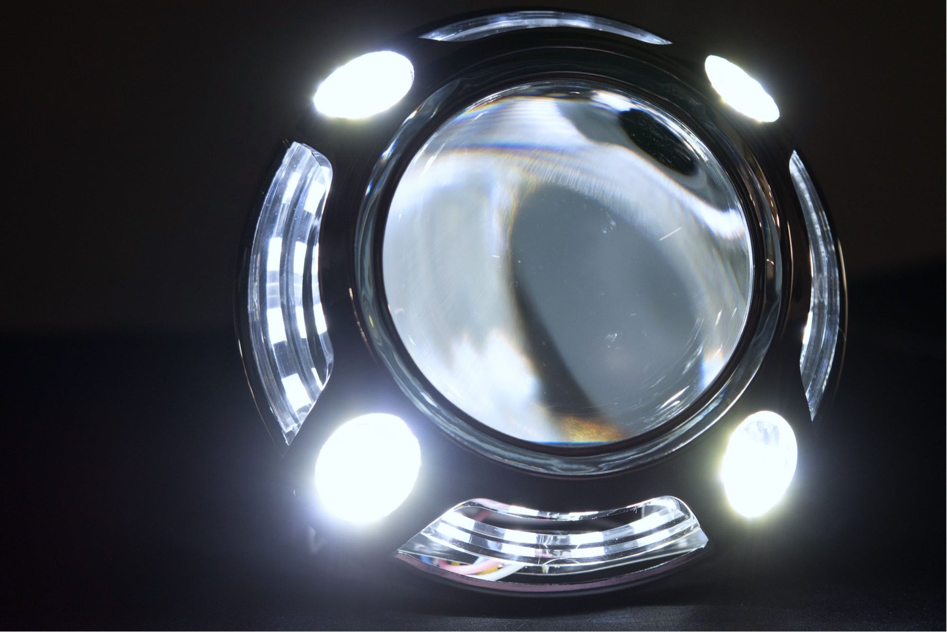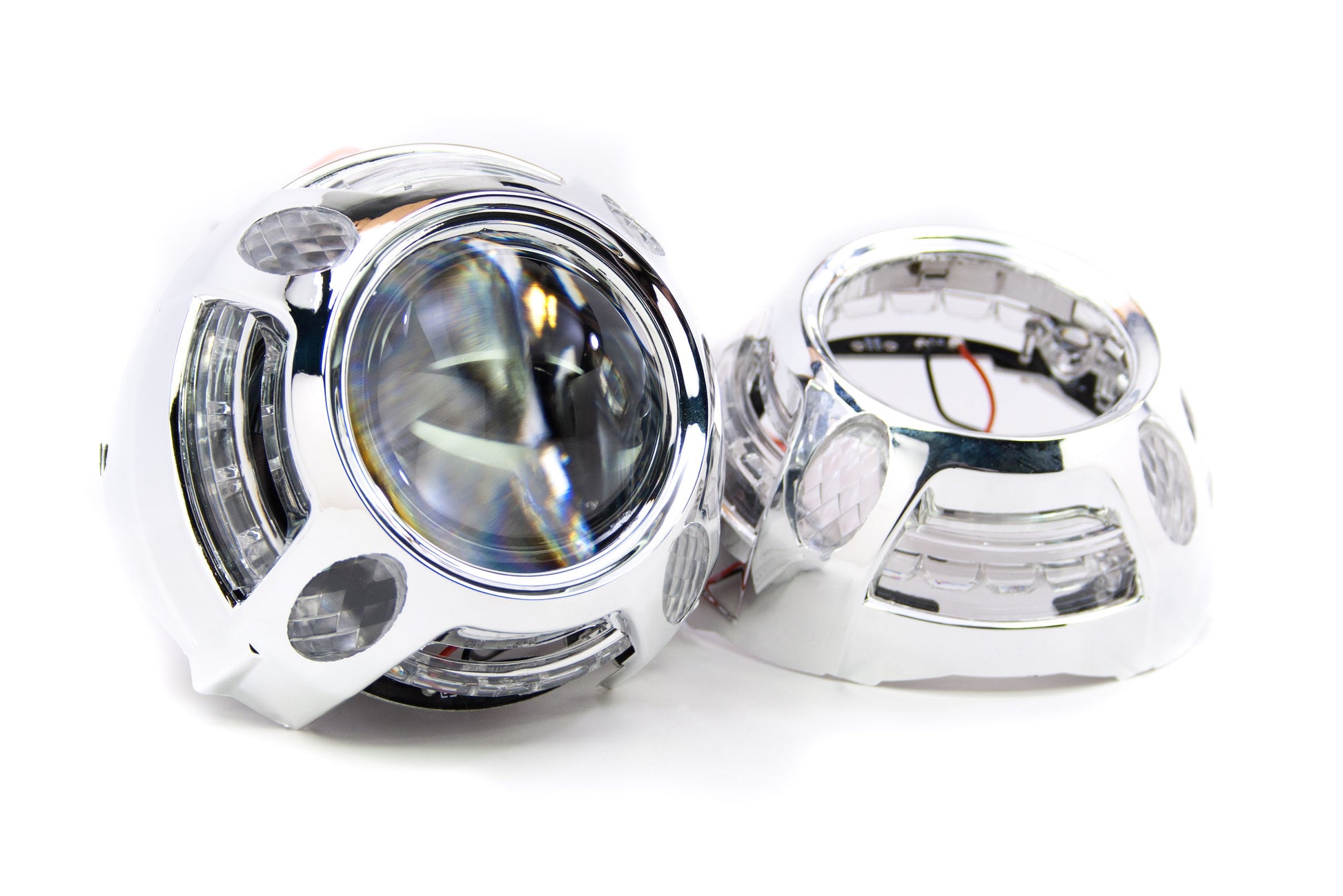 Panamera-LED: takes the original Panamera shrouds to an all new level of OEM plus! With a Type II White/Amber Switchback LED circuit built into the backside of the shroud that illuminates the four lenses on each corner, these are undoubtedly the most baller status shrouds we've ever offered. With excellent coverage for most projectors too, they're also very functional. In Comparison: Don't make the mistake of thinking all shrouds are created equal. Even though less expensive alternatives may be available elsewhere: Morimoto Panamera LED's use an XSB Switchback driver and high quality LED PCB in place of the cheap crap found in the generics. Their shrouds are made from the highest quality plastic and have by far the most durable metalized chrome finishes. The cheapo's out there are flimsy enough to deform from the heat just a 35W HID bulb, and their chrome finish easily flakes off. A or B: At our shop, we're also meticulous with quality control. If a shroud has a minor factory defect; we sell it at a discount as a "B stock" unit - which is perfect for budget retrofits or when painting them is part of the plans. If you won't settle for anything less than perfect and plan to leave them chrome; go for the "A Stock" Shrouds. Mounting: Centric Rings are not included by default, but are highly recommended to improve ease of installation on many projectors. The Centric Rings are simple reducers that clip into the shroud to reduce the inside diameter, making them more of a "press fit" onto the lens holder of the projector. JB Quik Weld is also recommended in order to prevent the shrouds from vibrating loose over time. LED Halos: Are a unique and effective way to further customize the look of your projector retrofit. The Profile Pivot (switchback) and Profile Pixel (RGB) systems are easy to mount on the front of your shrouds, are reliable, and of course awesome looking. To determine which size is best for you - check out the size-guide in the images above. Trimming: Please note that trimming shrouds is a common task when retrofitting. Whether required to clear part of the projector, or fit within the geometry of your headlight housing; it's normal. Luckily, they're made of plastic - making that easily possible. We recommend a Dremel hand tool with EZ Lock cutting wheels to make the job easy.