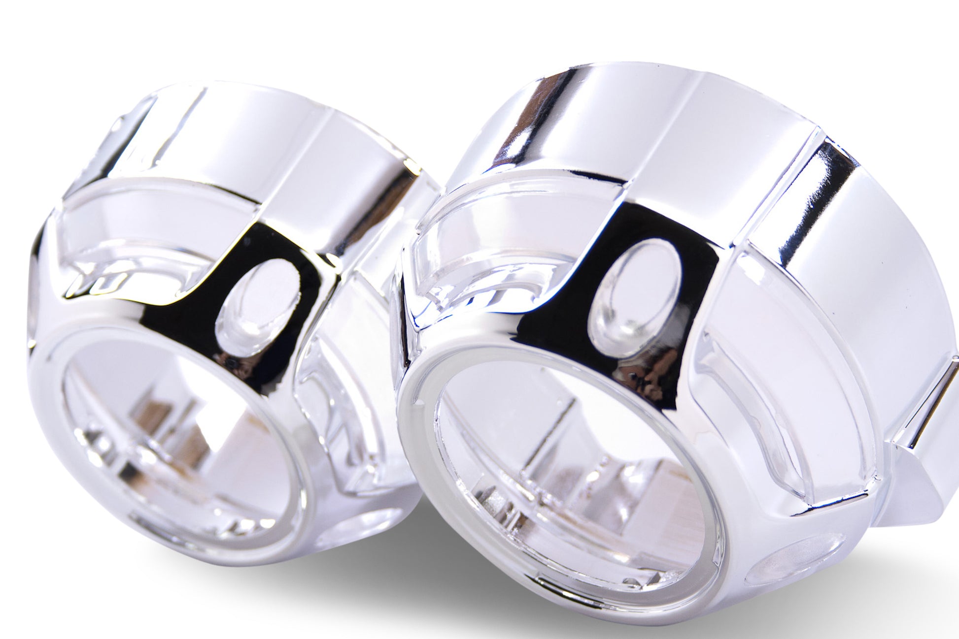 Panamera: Designed to cover the biggest of projectors, this two-piece shroud offers a design that's functional yet attractive. Inspired by the Porsche Panamera. This shroud can swallow everything from a smaller Morimoto Mini to a larger FX-R bi-xenon, and can be trimmed down to fit in medium headlights, or left whole to fill out gigantic housings. In Comparison: Don't make the mistake of thinking all shrouds are created equal. Even though less expensive alternatives may be available elsewhere: Morimoto shrouds are made from the highest quality plastic and have by far the most durable metalized chrome finishes. The cheapo's out there are flimsy enough to deform from the heat just a 35W HID bulb, and their chrome finish easily flakes off. A or B: At our shop, we're also meticulous with quality control. If a shroud has a minor factory defect; we sell it at a discount as a "B stock" unit - which is perfect for budget retrofits or when painting them is part of the plans. If you won't settle for anything less than perfect and plan to leave them chrome; go for the "A Stock" Shrouds. Mounting: Centric Rings are not included by default, but are highly recommended to improve ease of installation on many projectors. The Centric Rings are simple reducers that clip into the shroud to reduce the inside diameter, making them more of a "press fit" onto the lens holder of the projector. JB Quik Weld is also recommended in order to prevent the shrouds from vibrating loose over time. LED Halos: Are a unique and effective way to further customize the look of your projector retrofit. The Profile Pivot (switchback) and Profile Pixel (RGB) systems are easy to mount on the front of your shrouds, are reliable, and of course awesome looking. To determine which size is best for you - check out the size-guide in the images above. These shrouds feature DRL-Vents that will glow with light if you wanted to do something a bit different and mount the halos inside. Trimming: Please note that trimming shrouds is a common task when retrofitting. Whether required to clear part of the projector, or fit within the geometry of your headlight housing; it's normal. Luckily, they're made of plastic - making that easily possible. We recommend a Dremel hand tool with EZ Lock cutting wheels to make the job easy.