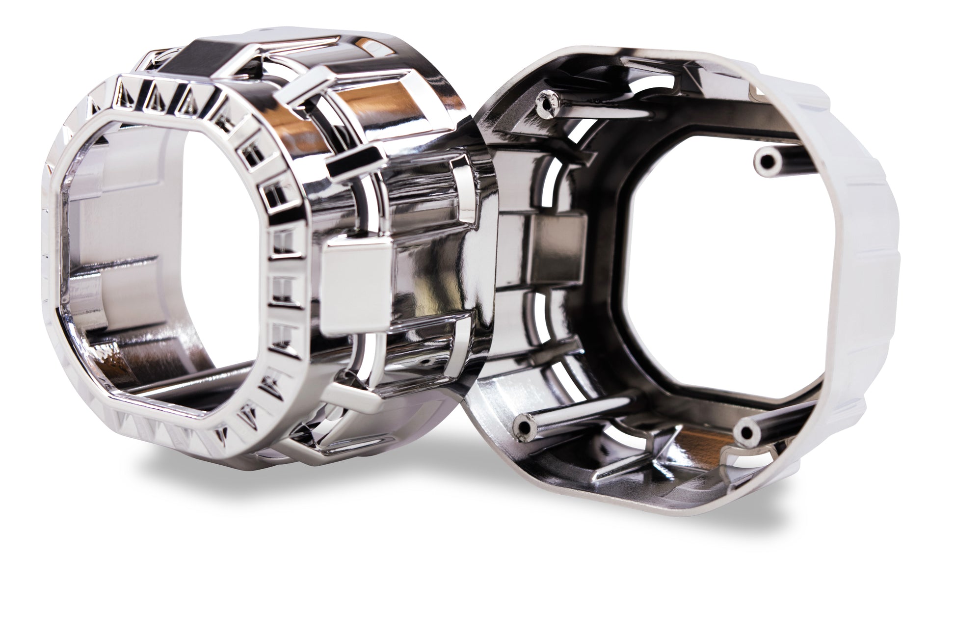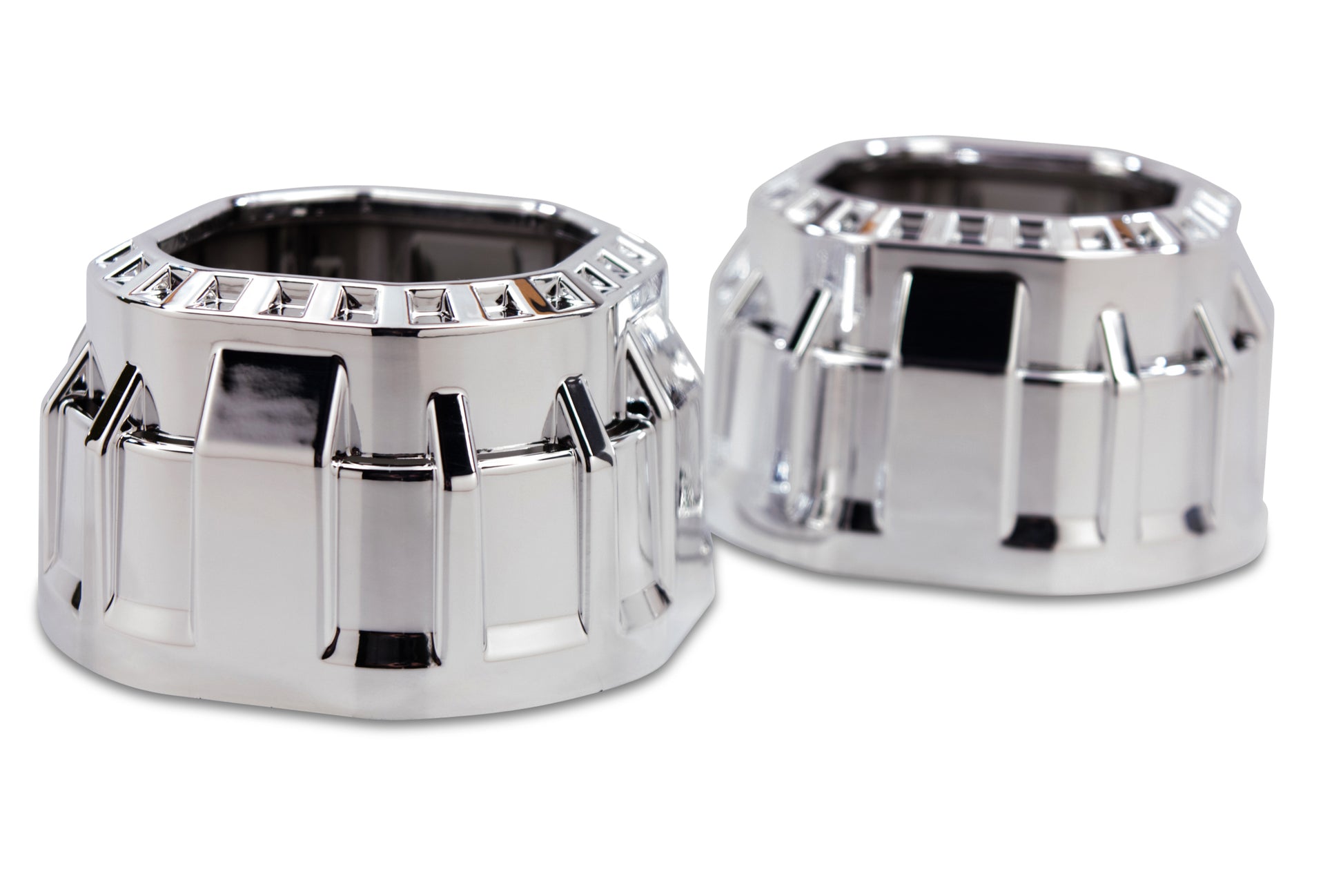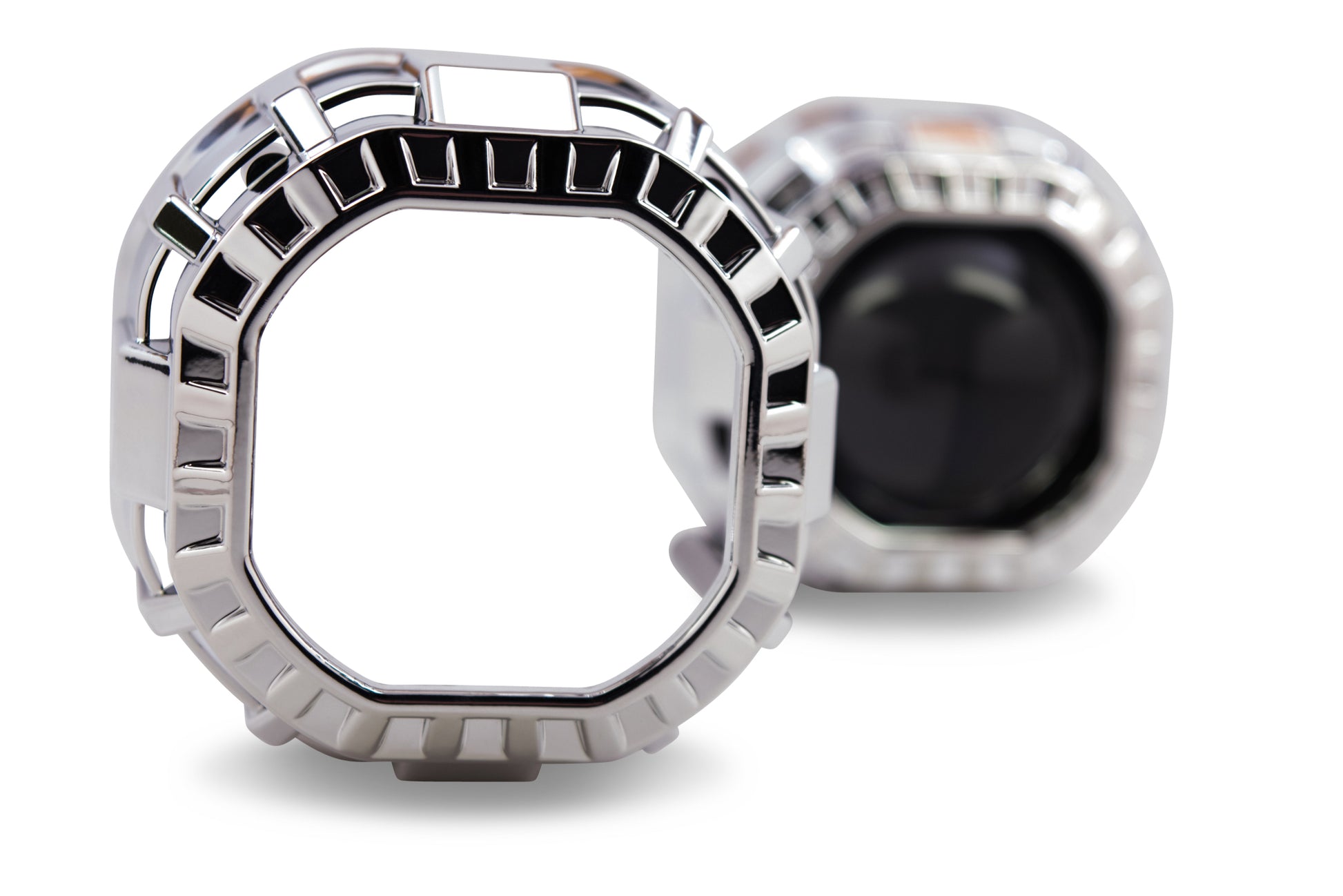 Hip to be Square: Often requested, but never delivered: a stylish square-lens version of the Mini H1 projector. Although a true square-lens version of the Mini H1 still doesn't exist and probably wont... here comes the next best thing: A revised version of the Mini Gatling shroud with a squared-off opening to surround the lens! In Comparison: Don't make the mistake of thinking all shrouds are created equal. Even though less expensive alternatives may be available elsewhere: Morimoto shrouds are made from the highest quality plastic and have by far the most durable metalized chrome finishes. The cheapo's out there are flimsy enough to deform from the heat just a 35W HID bulb, and their chrome finish easily flakes off. Unaffected: Though the geometry of the shroud cuts off part of the projector lens to create the squared off look, light output will be unaffected, believe it or not! Mounting: could not be any easier with the Square Mini Gats. Four internal posts line up to the bolt pattern on the mid-section of any generation Mini H1 projector, so they'll bolt right up! Trimming: Please note that trimming shrouds is a common task when retrofitting. Whether required to clear part of the projector, or fit within the geometry of your headlight housing; it's normal. Luckily, they're made of plastic - making that easily possible. We recommend a Dremel hand tool with EZ Lock cutting wheels to make the job easy.