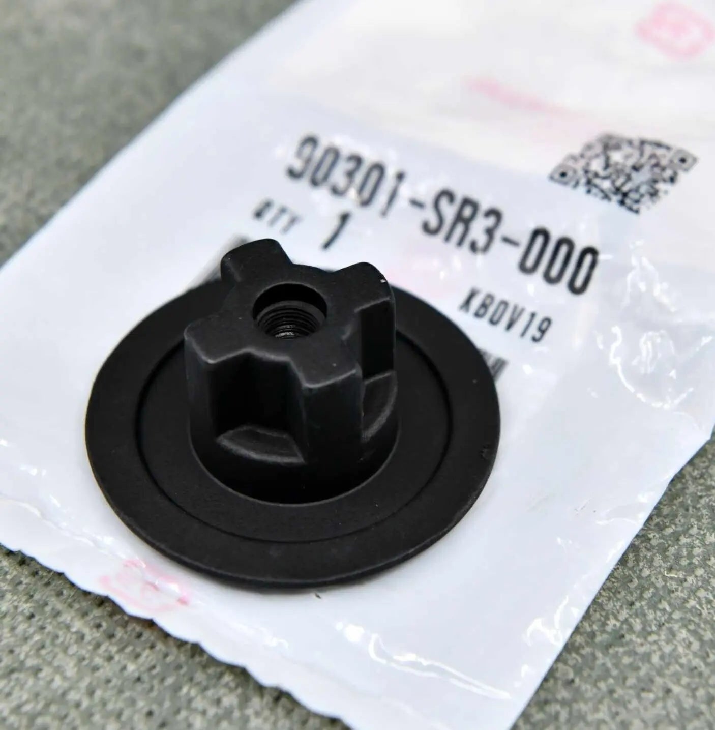 The 90301-SR3-000 is a genuine Honda OEM spindle nut designed to secure the front hub assembly to the axle shaft on select Honda models. This locking axle nut is critical for maintaining proper preload on the wheel bearing and preventing movement under torque and suspension load. A must-replace item when servicing axles, hubs, or doing front-end suspension work.