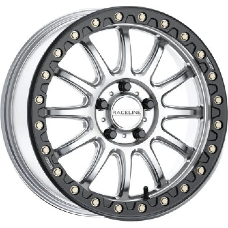 Raceline A14SB Alpha 15x7in/4x156 BP/10mm Offset/132.5mm Bore - Silver & Blk Ring Beadlock Wheel