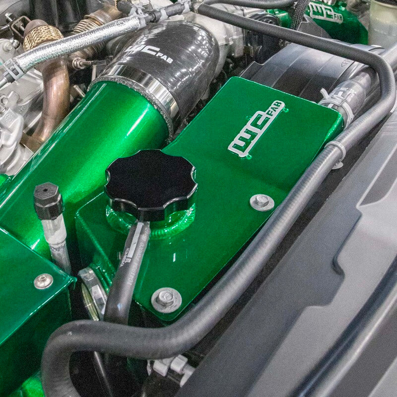 The WCFab Secondary Coolant Tank Kit for the 2017-2024 Ford Super Duty equipped with the 6.7L Power Stroke Diesel engine replaces the uglyOEM plastic reservoir on the passenger side front of the engine bay, and is a great way to dressup under the hood of your truck. This fabricated aluminum coolant reservoir mounts in the OEM location and retains necessary connections for all factory hoses. Includes billet aluminum sight glass and black anodized coolant cap.